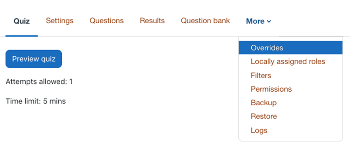Some students may have additional time requirements as part of their academic accommodations with DRES. These directions will walk you through adding more time for a quiz, lesson, or assignment in Moodle.