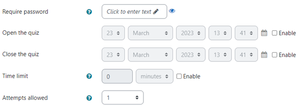 - Set the new open and close date, time limit, attempts allowed, and/or required password accordingly.